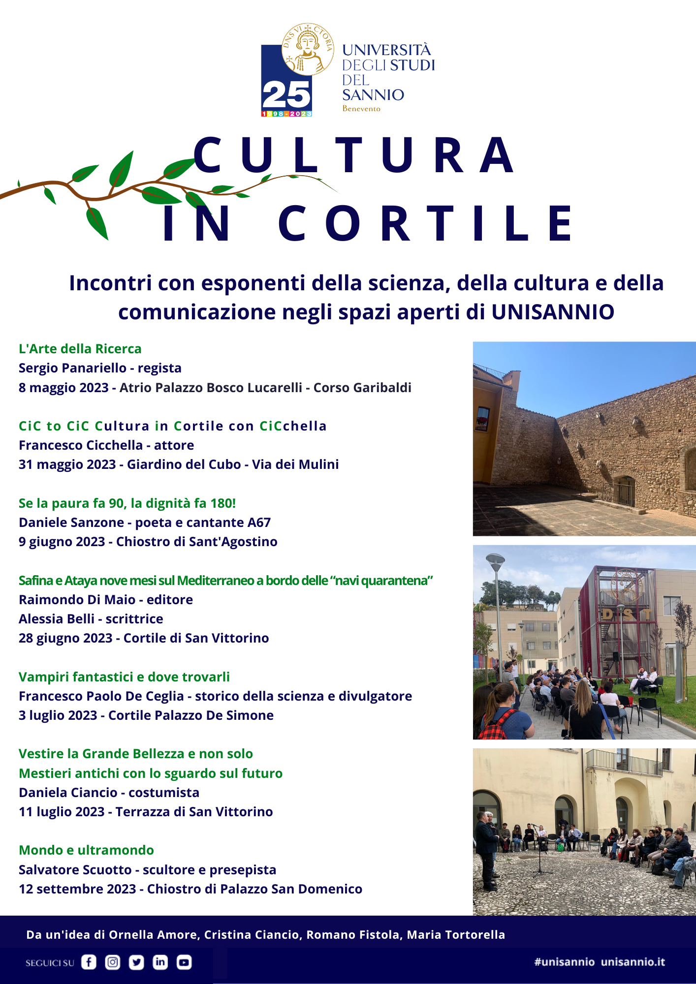 L'Università del Sannio apre le sue corti e i suoi chiostri alla cultura. Da maggio a settembre sono in programma per l'edizione 2023 di Cultura in Cortile sette incontri con esponenti della scienza, della cultura e dello spettacolo. L’ateneo apre le proprie strutture alla città, a iniziative culturali e di confronto capaci di coniugare crescita culturale e socializzazione. Un modo per far conoscere angoli nascosti e preziosi delle strutture universitarie e dialogare su vari argomenti in maniera informale e partecipata.